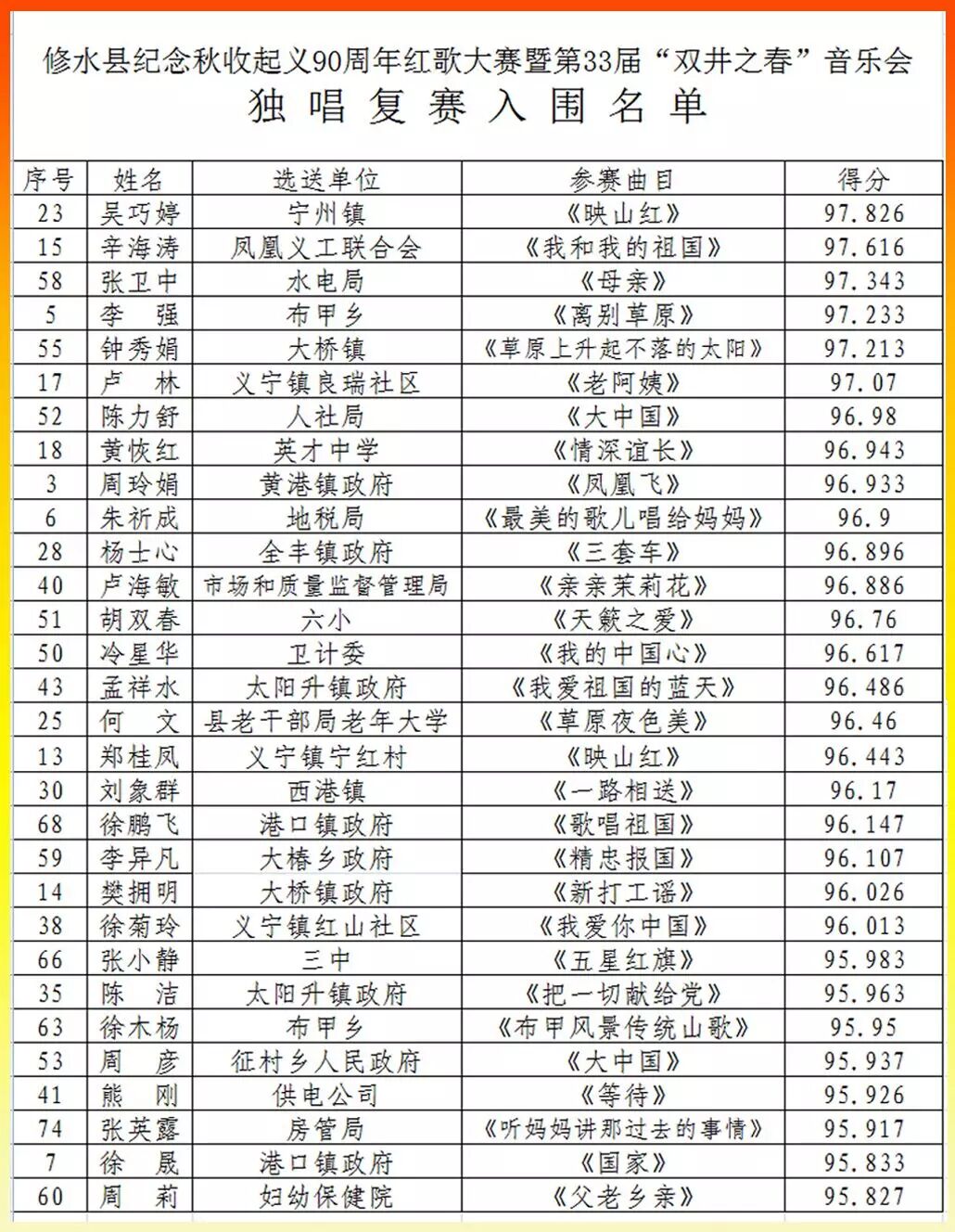 5月18日,修水县纪念秋收起义90周年暨第三十三届双井之春音乐会在良塘文化广场举行,77名来自全县各乡镇、县直各单位(含驻县)的选手参加了独唱类别的初赛,经过激烈角逐,遴选出前30名进入复赛,复赛将于本月21日在秋收起义团部旧址前举行。