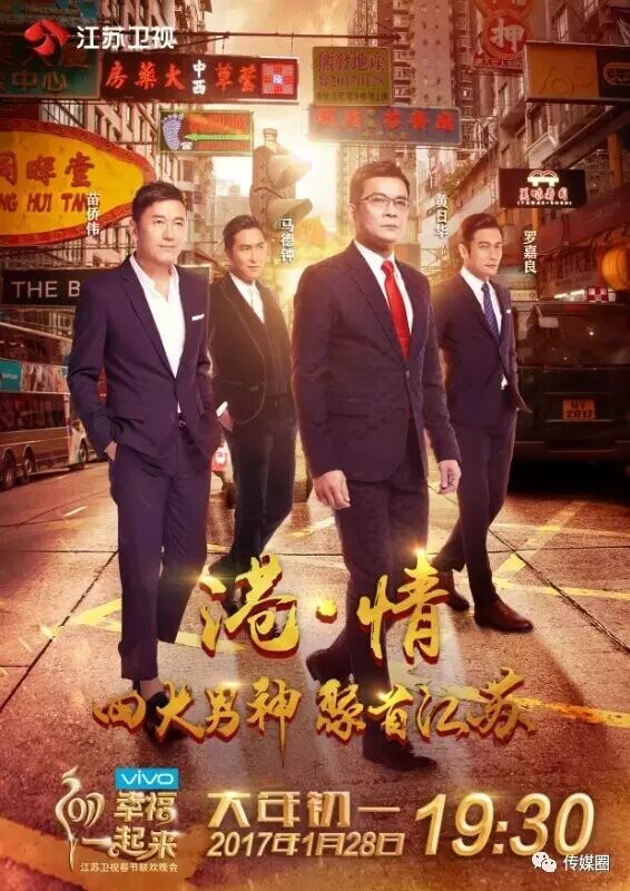 黄日华、苗侨伟、罗嘉良、马德钟四位TVB男神的同台表演,成为了江苏卫视春晚对2017香港回归20周年的献礼。