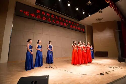 此次大赛共有十个教研组登台亮相。比赛在音乐组的5位美女老师《映山红》的歌声中开始,她们身着黑色礼服,发系闪光红花,时尚而不失优雅;体育组4位帅气汉子歌声嘹亮,;一年级语文组的老师把可爱的孩子们也领上了舞台,温柔似水的歌声伴着稚嫩的童声,用唯美的方式传承着红色的精神;阵容庞大的数学组齐唱《歌唱祖国》,在台上依旧保持着自己平日的严谨作风;二年级语文组的老师们身着华美的晚礼服,用《国家》抒发着自己的爱国情怀;行政组结合诗朗诵、独唱、合唱等表演形式重新演绎了红色经典《南泥湾》;综合组的老师则综合各科特长,用B-BOX、RAP、陕西方言等新潮的演唱方式将红歌的魅力最大化地呈现在观众的视听觉中。英语组和三年级语文组的老师们想象力更是丰富,将《走西口》《红色娘子军》等经典红歌串联成了歌舞剧,精彩的剧情和动听的演唱扣人心弦;最后,整场比赛在高语组老师们温婉的《绣红旗》歌声中结束。