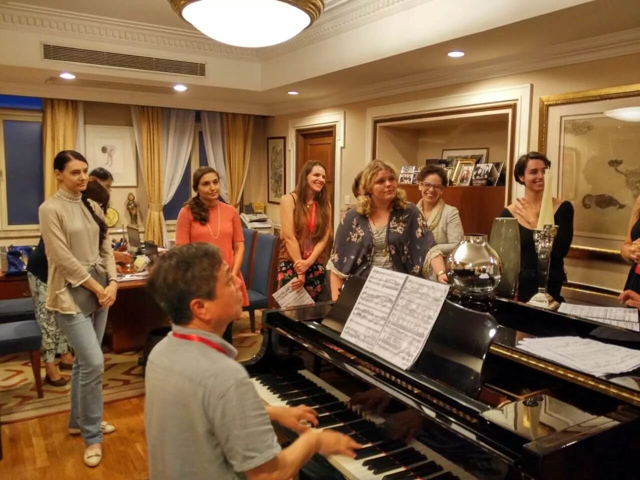 视频中,钢琴旁清一色的高鼻梁深邃眼睛,不大的房间里,14名老外站在钢琴前,随着钢琴的演奏分声部歌唱。