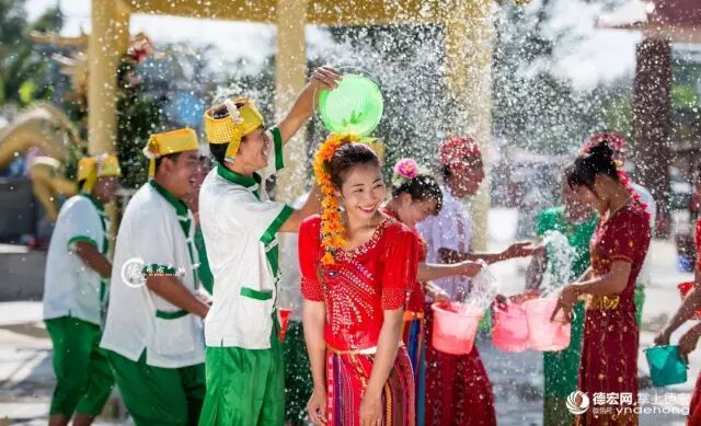 陇川乡村泼水,男女老少都会穿上节日盛装,挑着清水,先到佛寺奘房赕佛、浴佛,然后就开始互相泼水,互祝吉祥、幸福、健康。