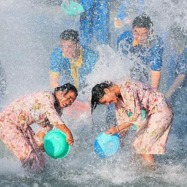 跳舞的同时,不管男女老少就开始互相泼水,互祝吉祥、幸福、健康。祝福的水花到处飞溅,场面到都是欢乐的笑声。