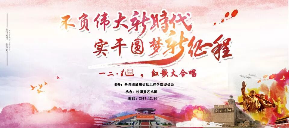为了纪念一二·九爱国运动,培育和弘扬民族精神,,深化爱国主义和革命传统教育,不断增强学生的爱国意识与艰苦奋斗的作风,同时活跃校园气氛,丰富校园文化生活,特举办泉州信息工程学院新生歌咏比赛。