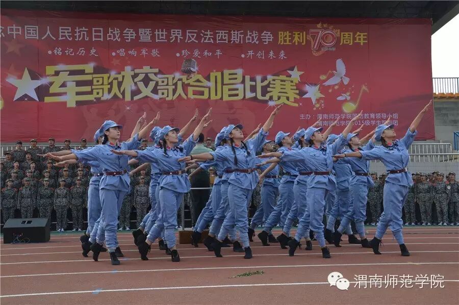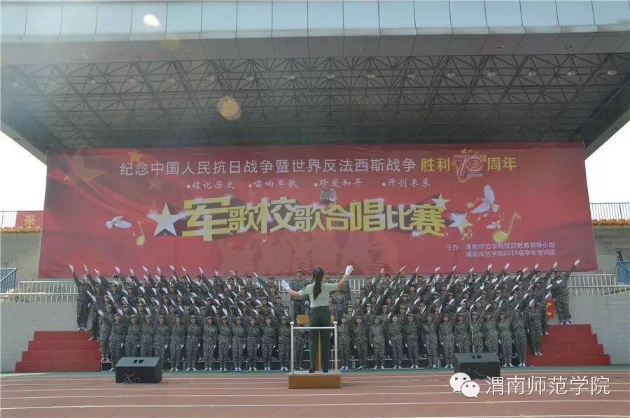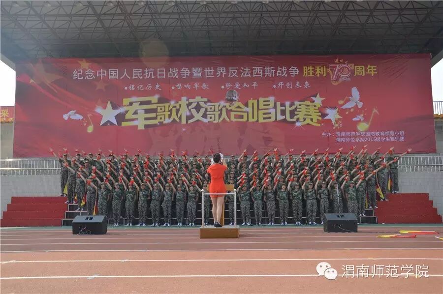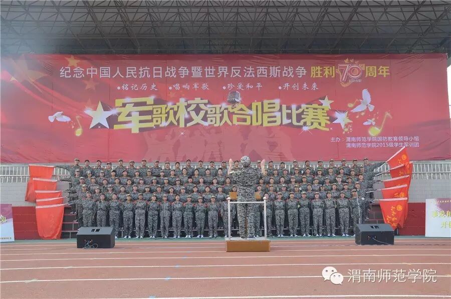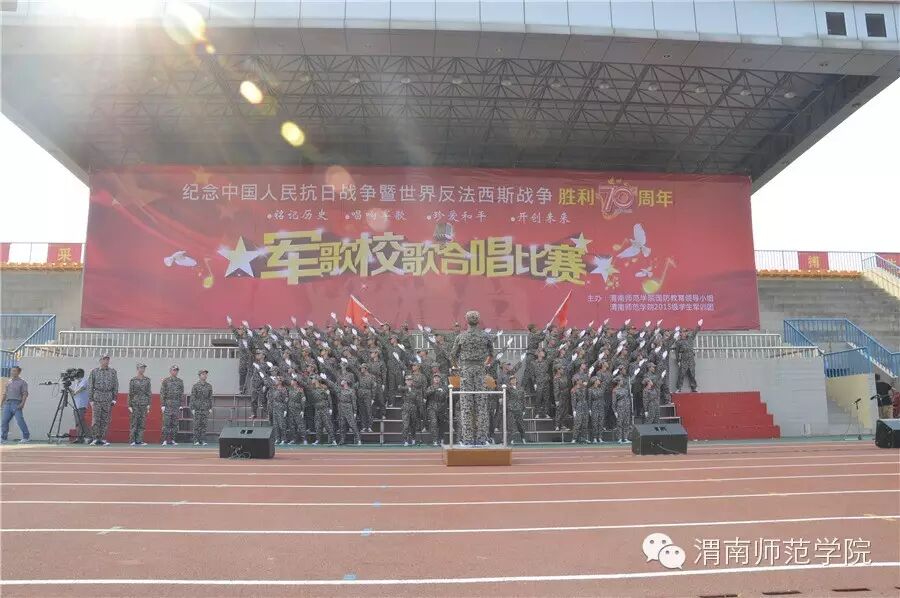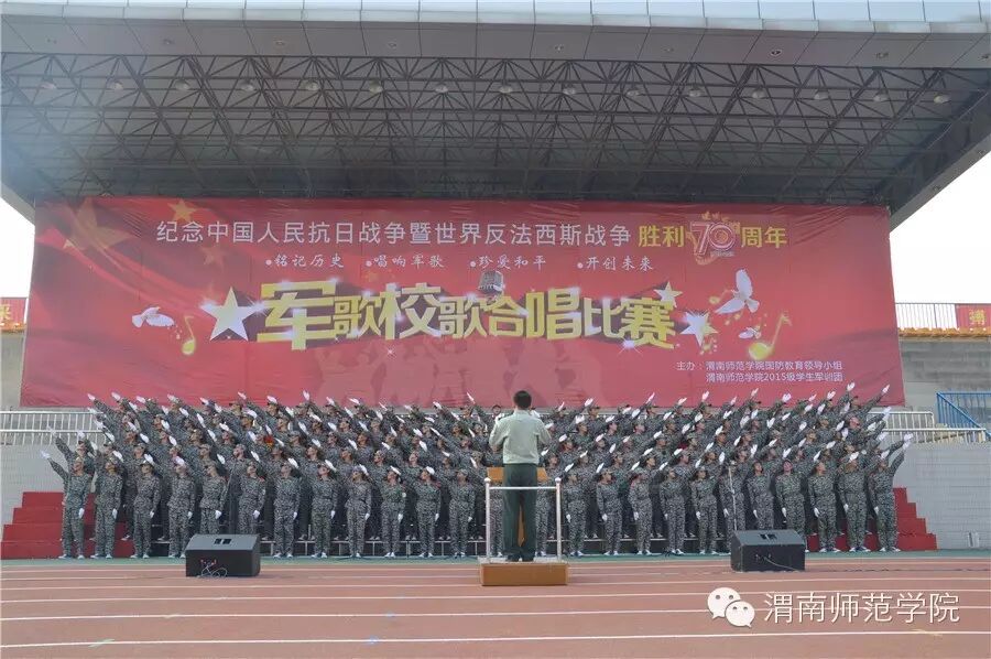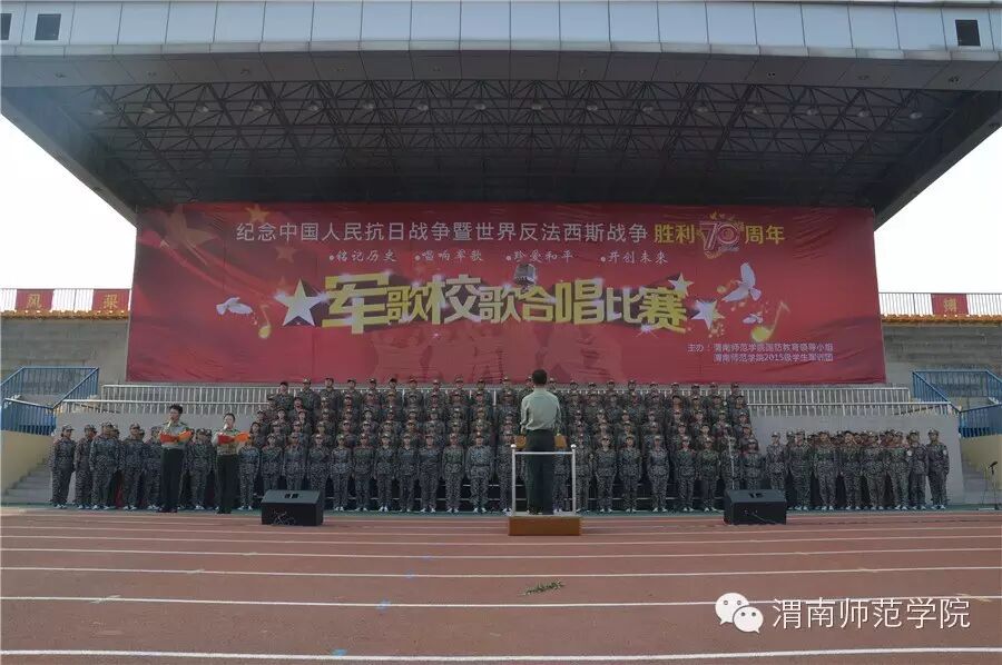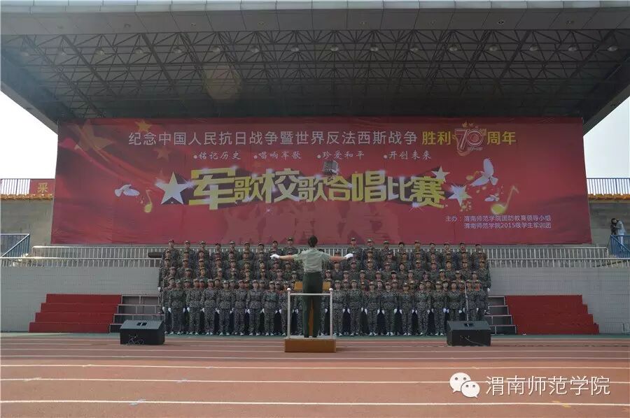 9月21日14点30分,渭南师范学院纪念中国人民抗日战争暨世界反法西斯胜利70周年『军歌校歌合唱比赛』在学校田径场隆重举行。比赛中,2015级新同学们歌声嘹亮,气势恢宏,展现出新时代年轻人的飒爽英姿。11个二级学院的合唱队伍风采各异,形式多样,用优秀的演唱赢得在场观众阵阵热烈掌声。