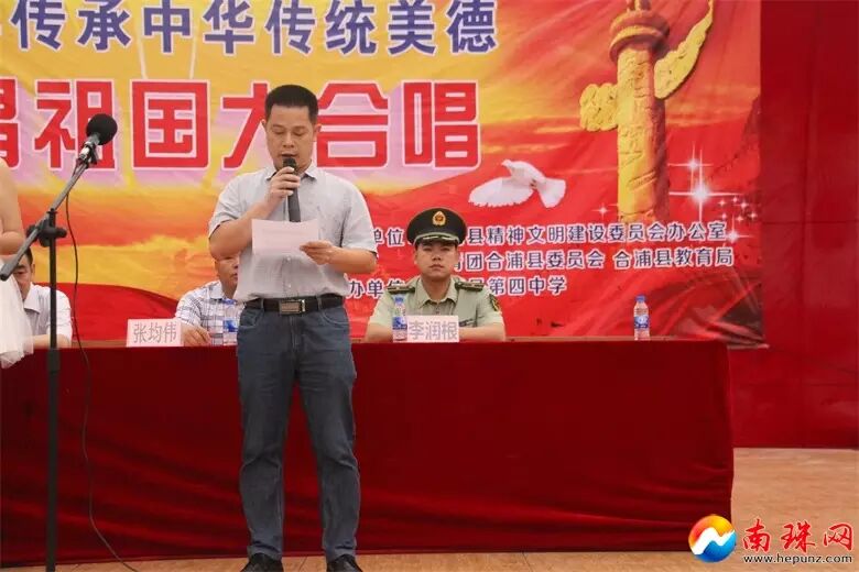 本次大合唱比赛活动的主题为“做一个有道德的人·青少年传承中华美德歌唱祖国”,由县委宣传部、团县委、县教育局主办,合浦县第四中学承办。参加此次活动的有县委宣传部副部长莫谦新、团县委副书记苏志腾、县教育局主任科员何兆锋、乾江派出所副所长李润根和合浦四中非毕业班全体师生。