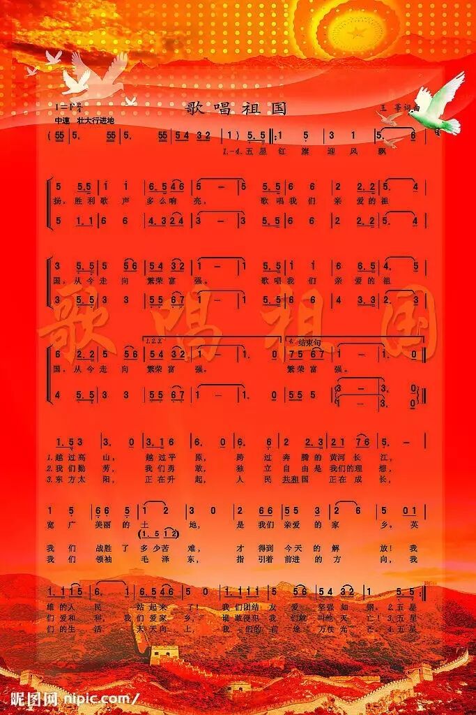《歌唱祖国》由王莘作词、曲,是著名的爱国歌曲。创作于1950年9月,适逢新中国成立一周年,,鲜花如海的热闹景象,王莘脑海里反复酝酿,《歌唱祖国》是在回津的列车上一气呵成。这首歌曲发表后因其明快雄壮的韵律而广为传唱,现在已经成为中国各种重大活动的礼仪曲、开场曲或结束曲,号称“第二国歌”。