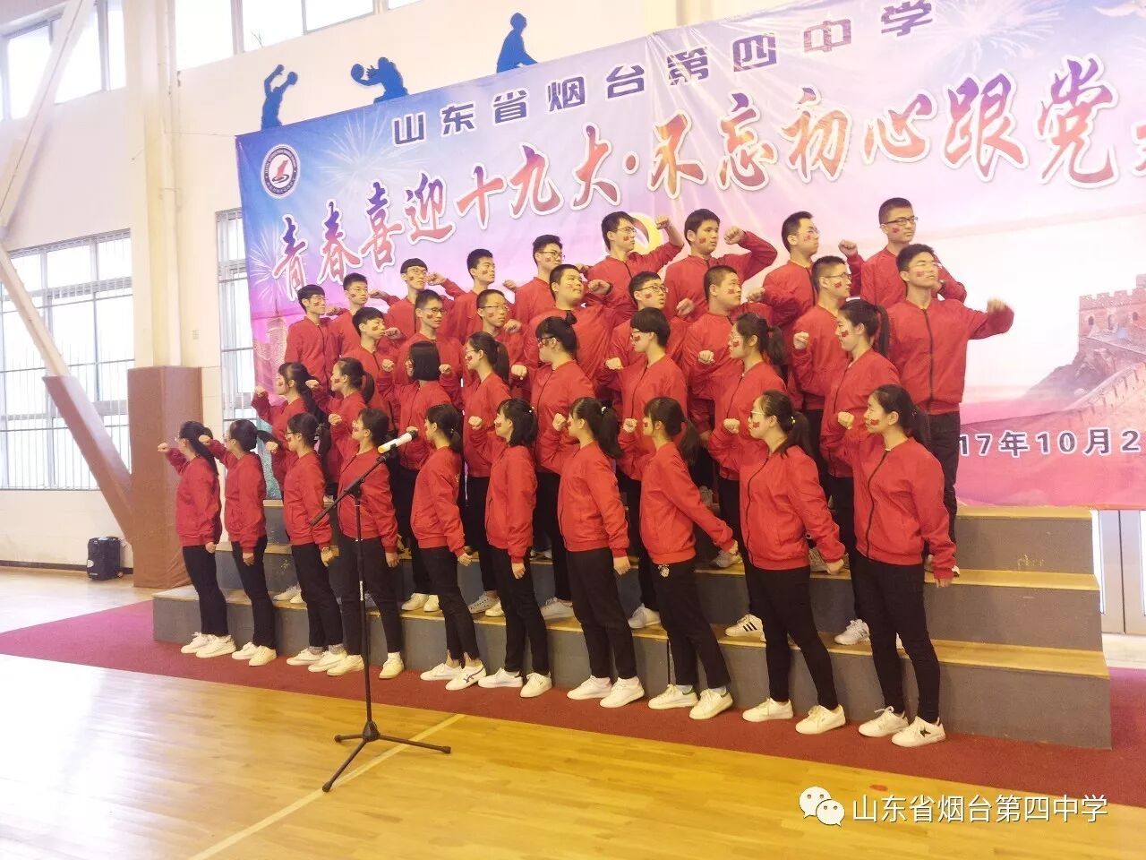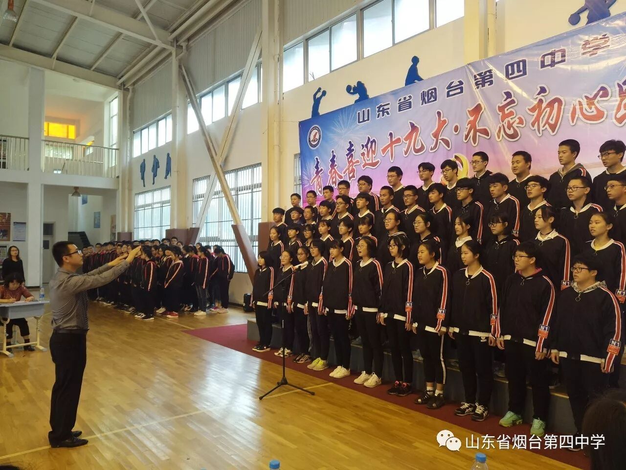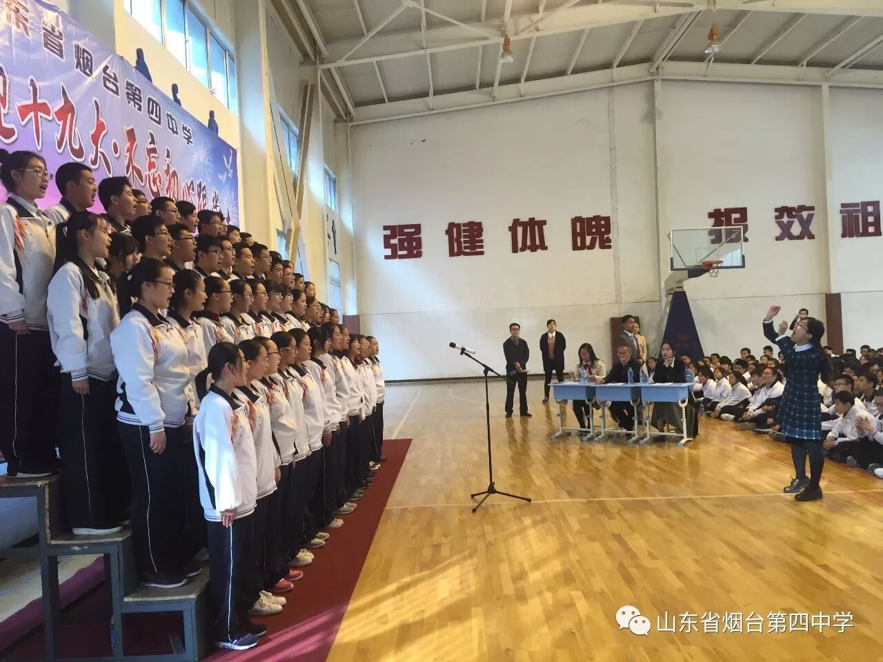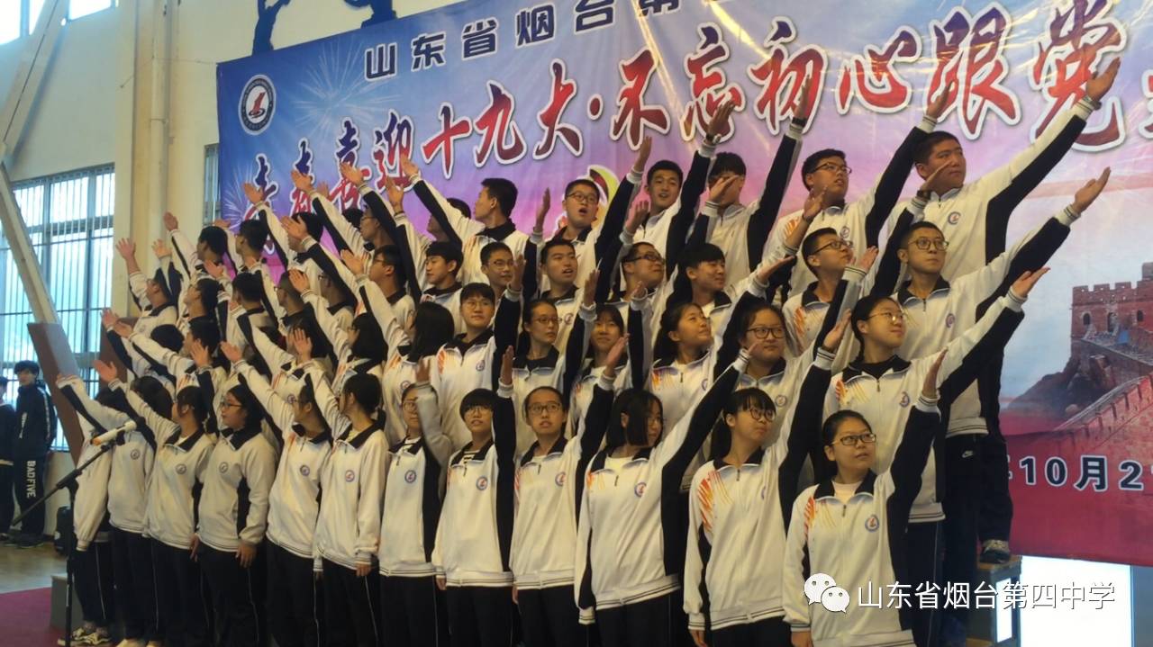 10月21日上午,烟台四中“青春喜迎十九大 不忘初心跟党走”主题合唱比赛在学校体育馆隆重举行。高一、高二全体师生近1400人参加了此次活动。