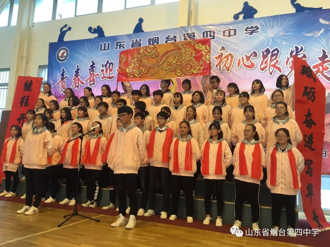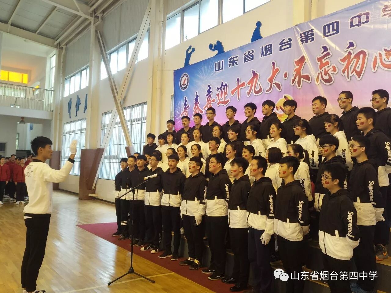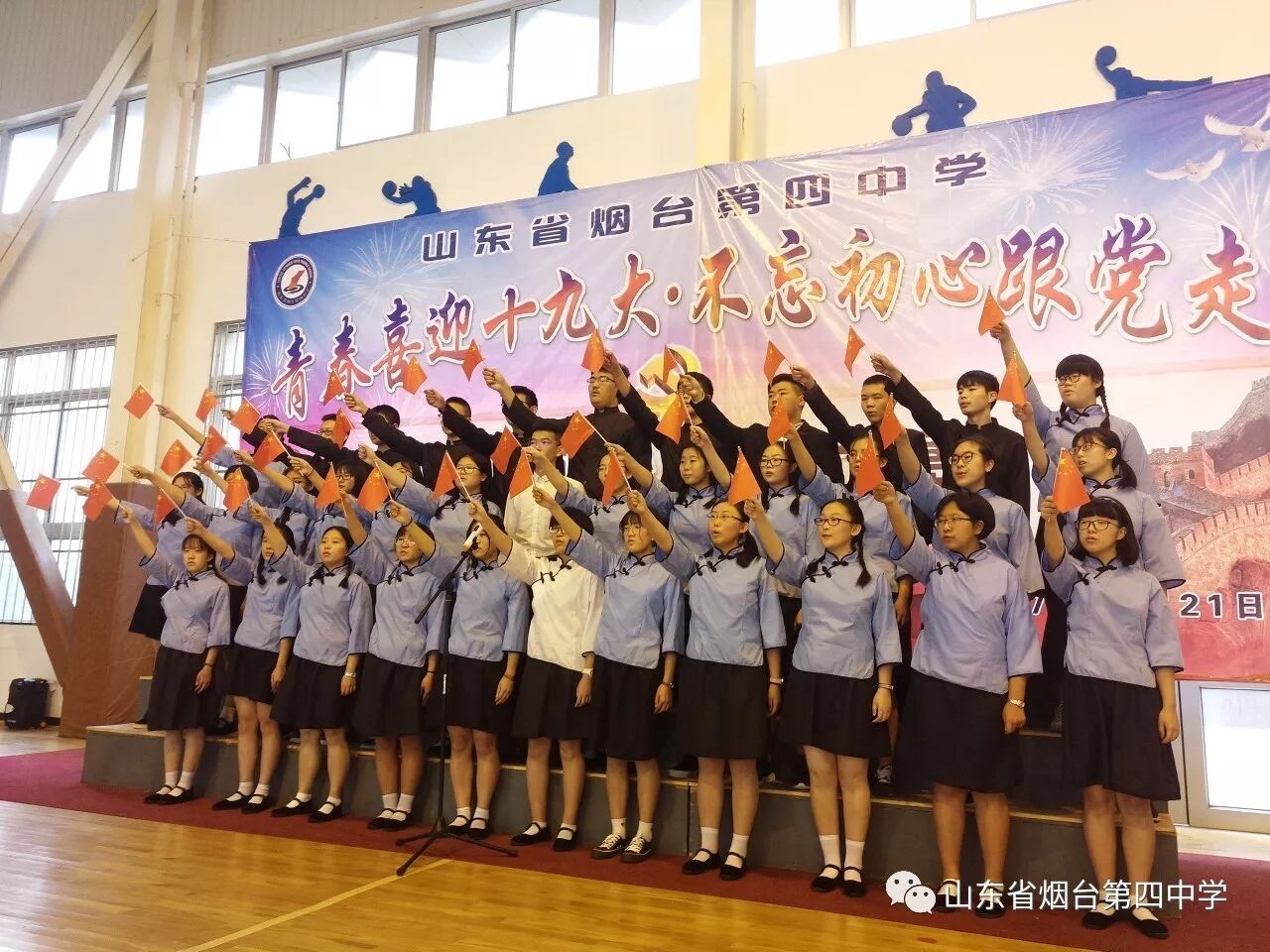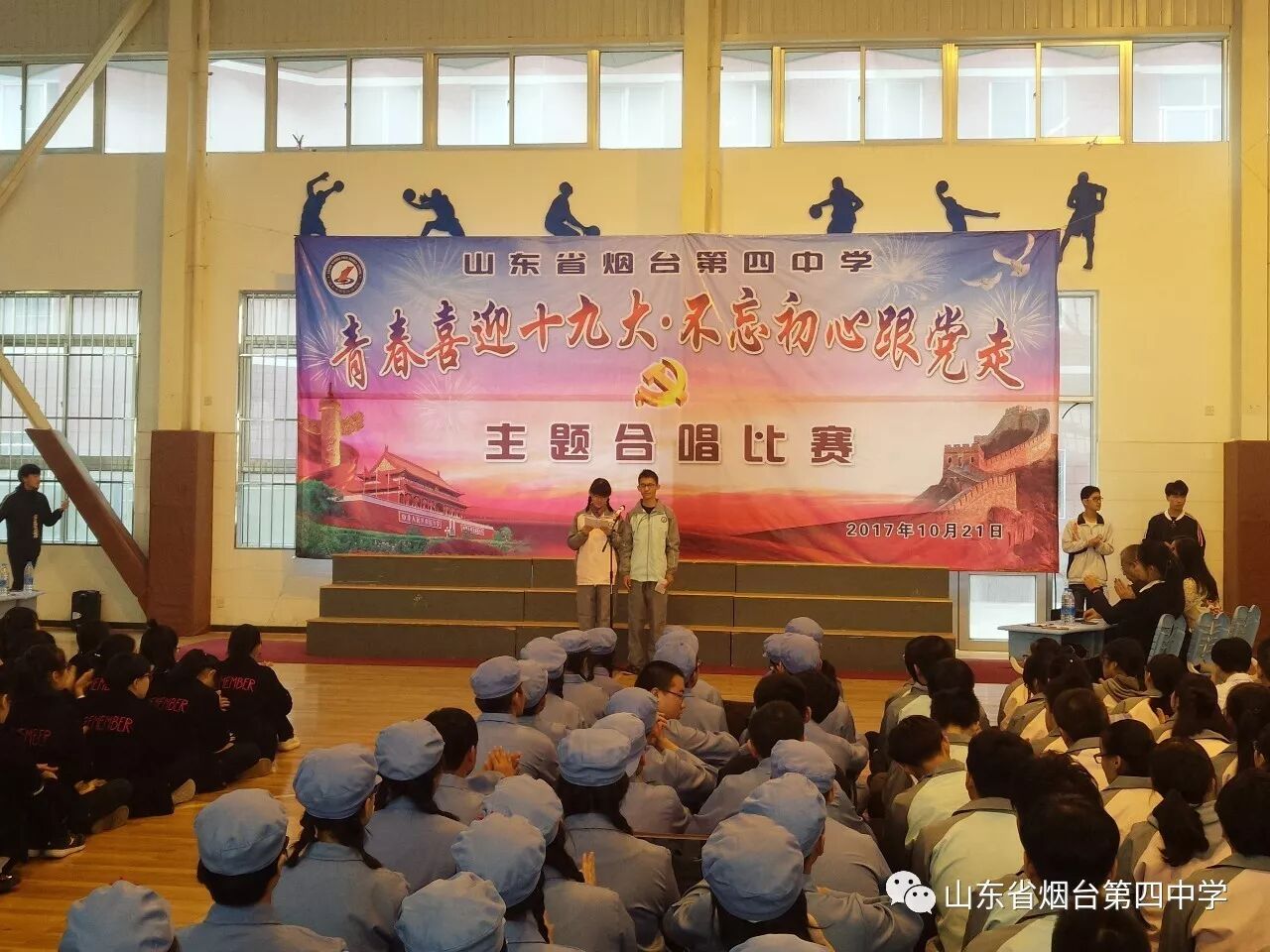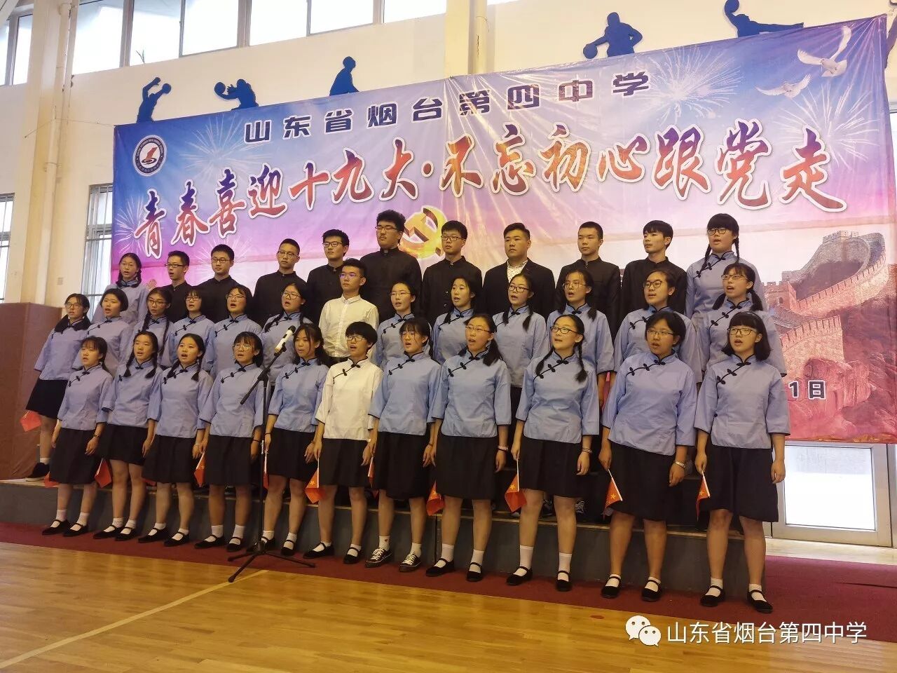 10月21日上午,烟台四中“青春喜迎十九大 不忘初心跟党走”主题合唱比赛在学校体育馆隆重举行。高一、高二全体师生近1400人参加了此次活动。