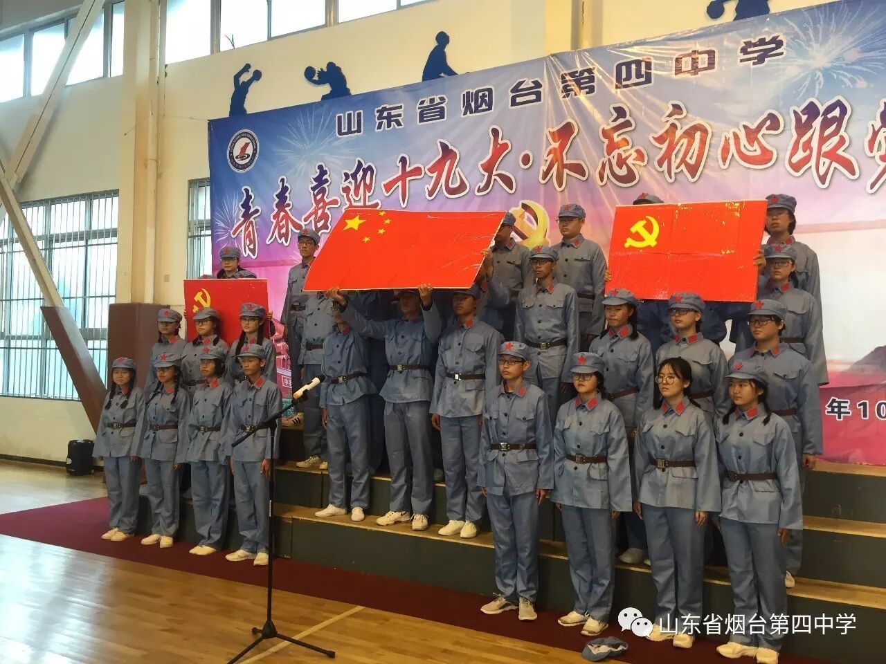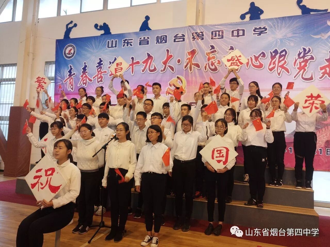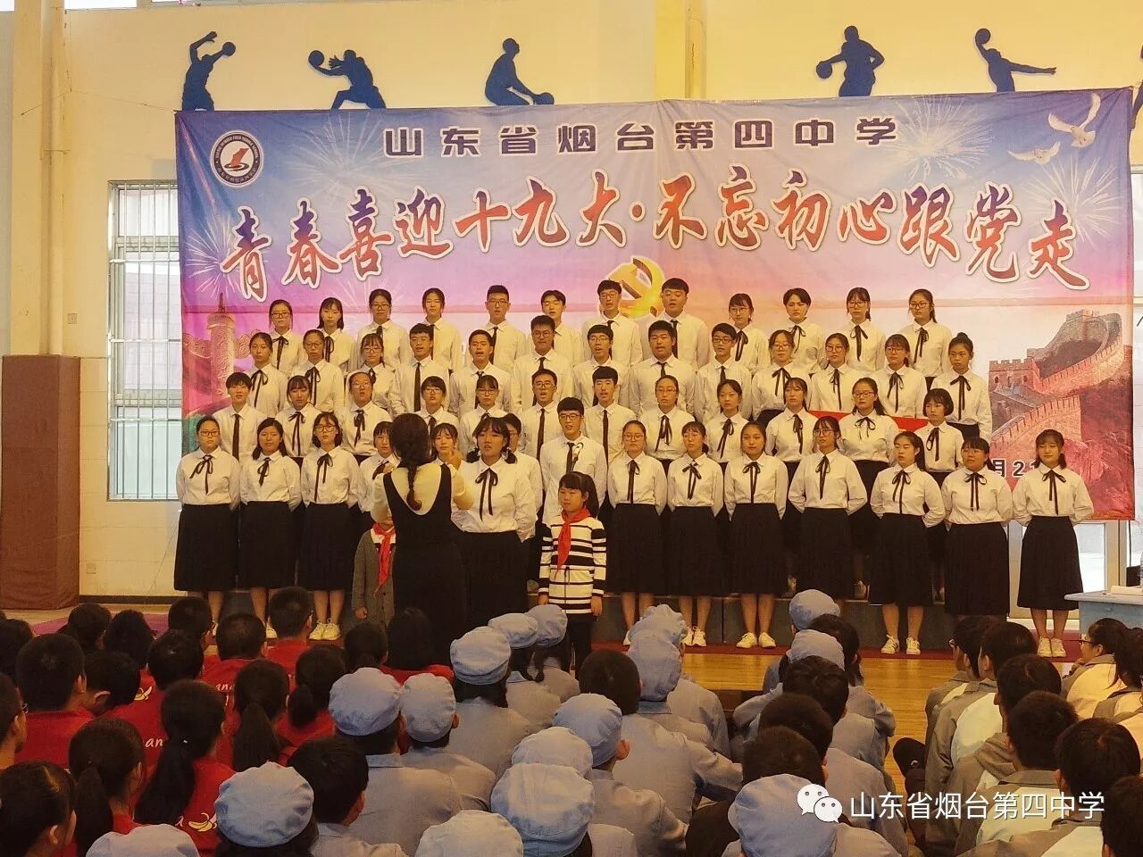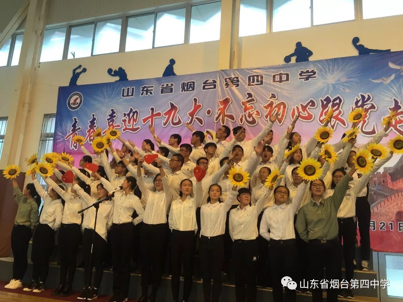 10月21日上午,烟台四中“青春喜迎十九大 不忘初心跟党走”主题合唱比赛在学校体育馆隆重举行。高一、高二全体师生近1400人参加了此次活动。