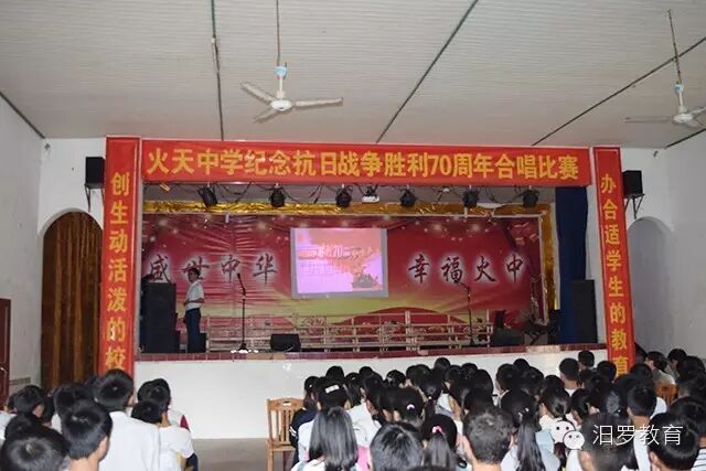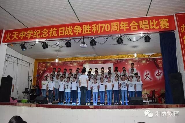 为纪念抗日战争胜利70周年,继承和发扬党的光荣传统和优良作风,进一步加强校园文化建设,增强广大师生热爱祖国、珍惜和平的意识, 10月13日,火天中学举行了以“祖国在我心中”为主题的爱国歌曲合唱比赛。