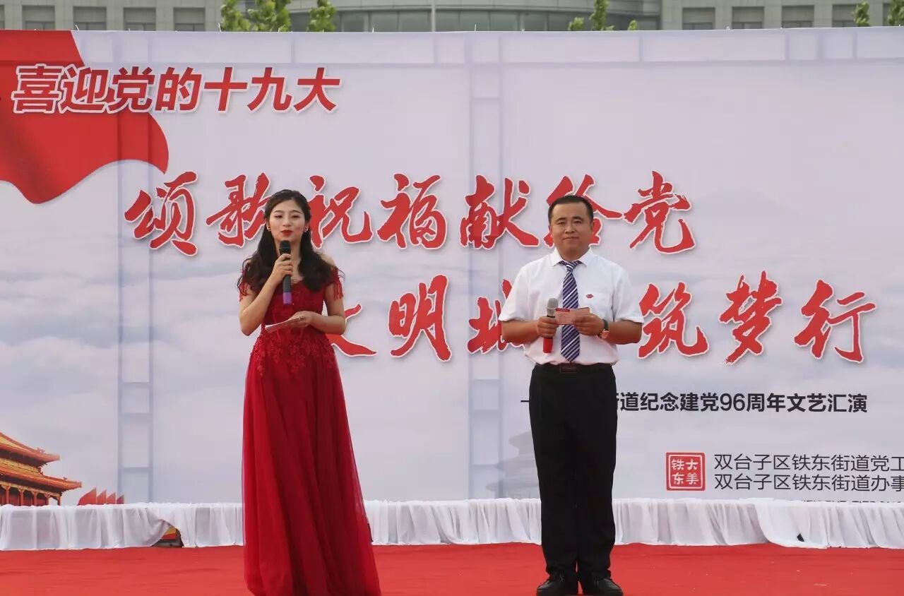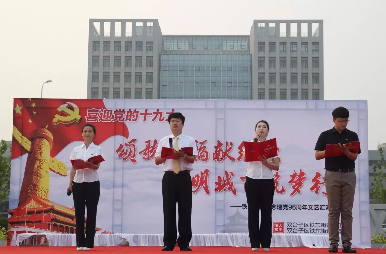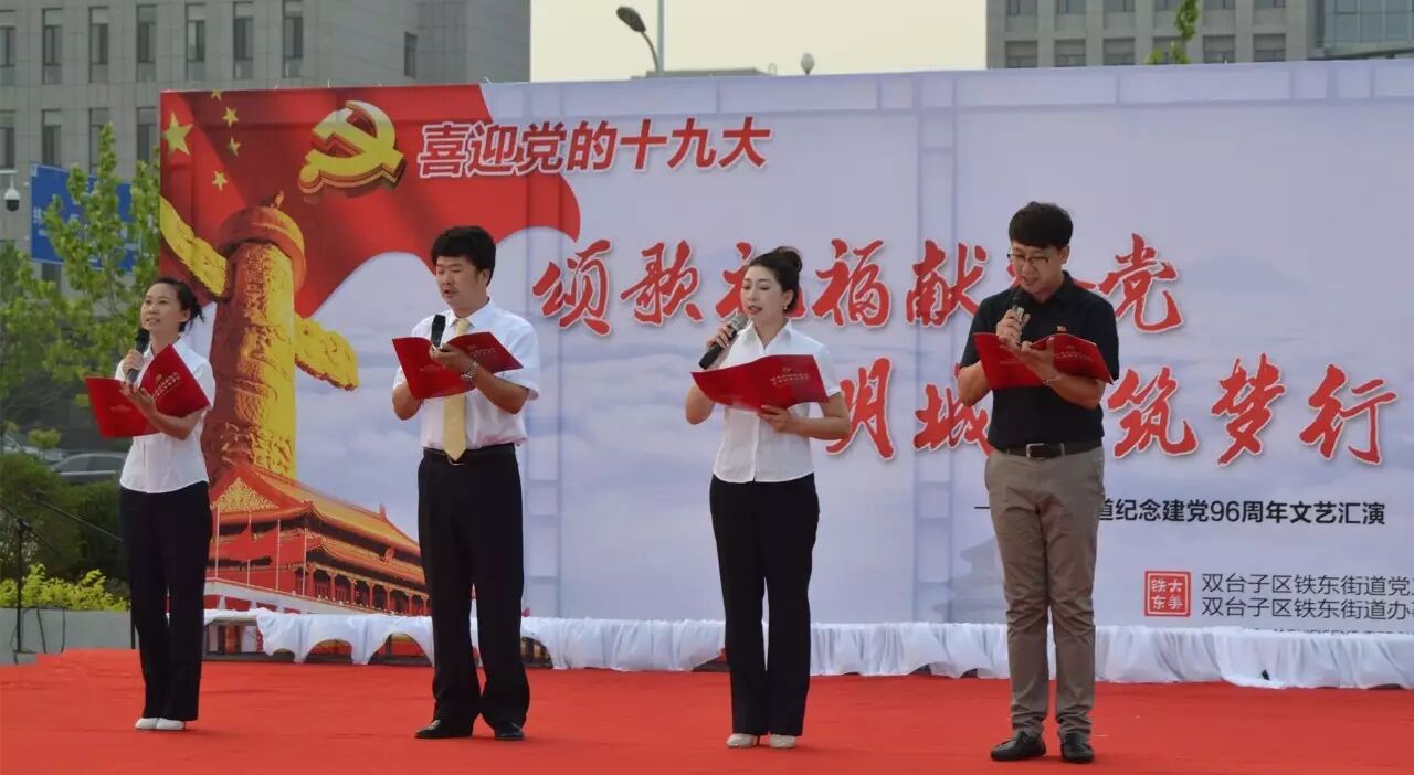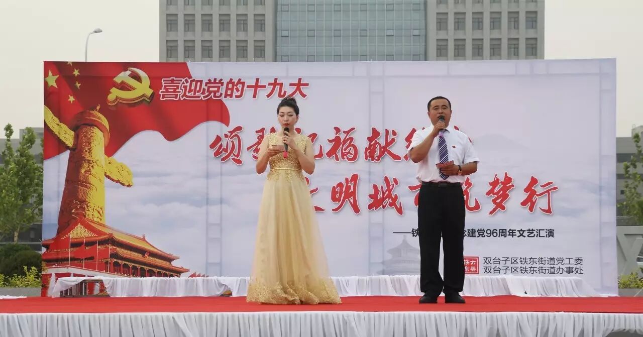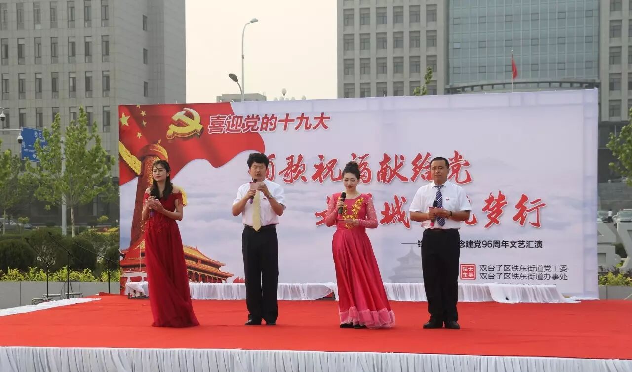 ,喜迎党的十九大召开,进一步推进“两学一做”学习教育常态化、制度化,集聚正能量,筑梦文明城,2017年6月30日,铁东街道在双台子市民活动公园举办了以“颂歌祝福献给党 文明城市筑梦行”为主题的文艺汇演。