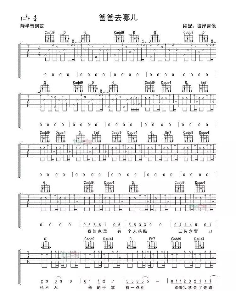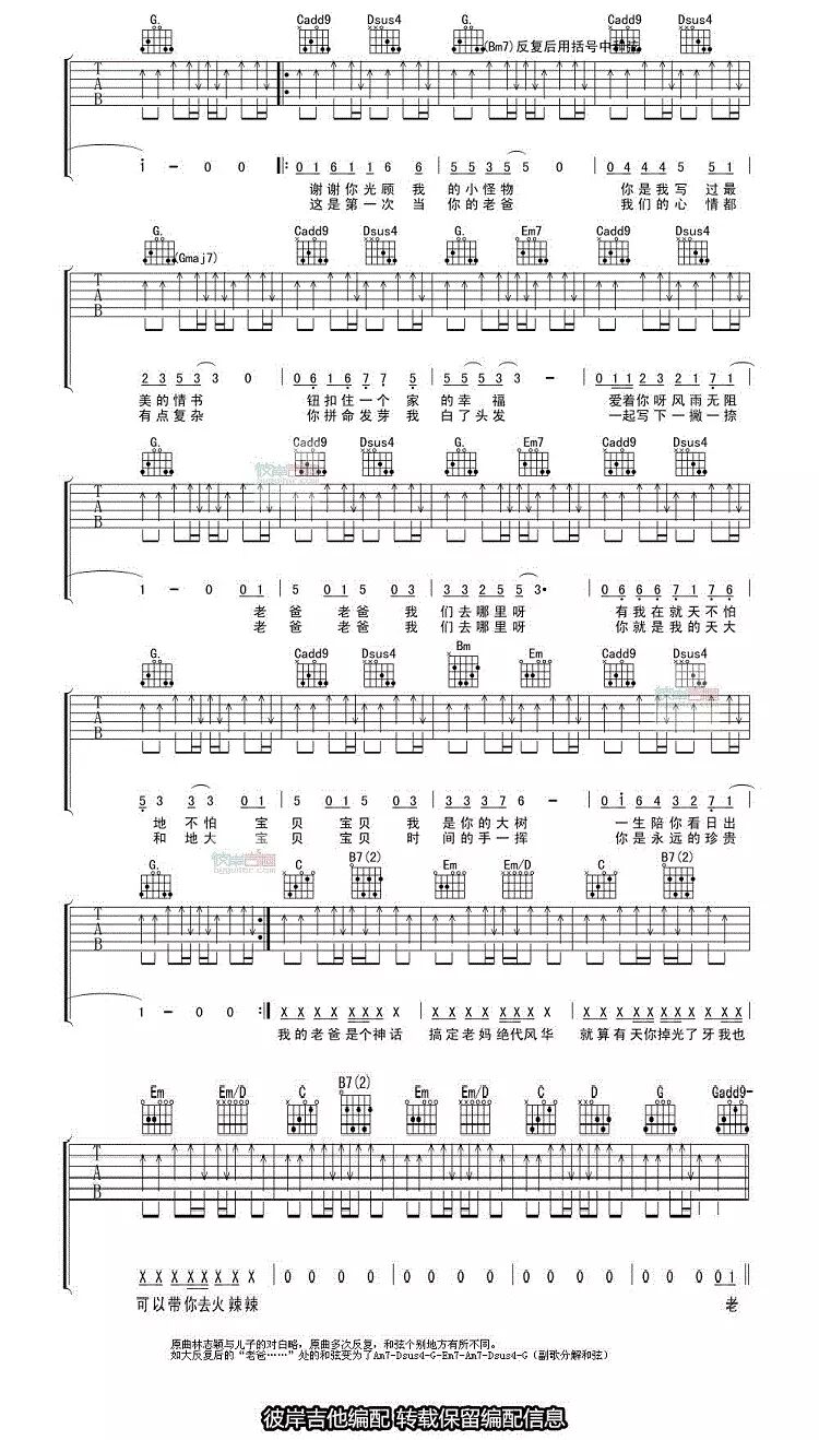 湖南卫视热播明星亲子节目《爸爸去哪儿》主题曲,主题曲由各位明星和子女共同演唱。吉他降半音调弦,原曲中林志颖与儿子的对白略。