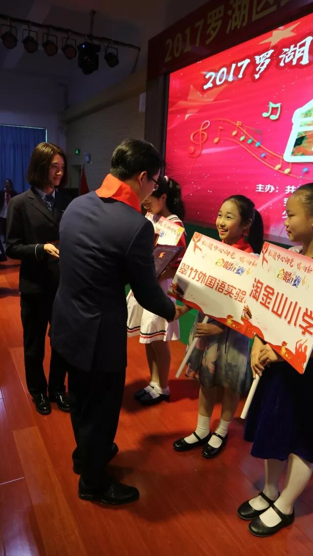 翠竹外国语实验学校合唱团50名团员在大队辅导员何艾老师的带领下,参加了此次比赛,以一曲《少年少年祖国的春天》获得比赛一等奖。