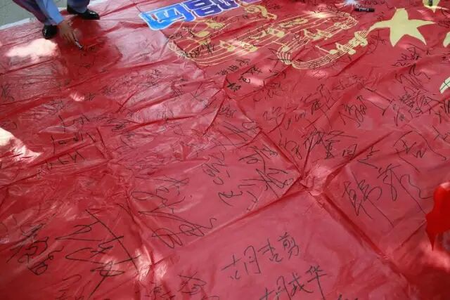 在开始之前,到场的每一位演职人员、歌友、摄影师们都在健康之声的团旗上签上自己的名字,每个人在签字的时候都有一种自豪感。