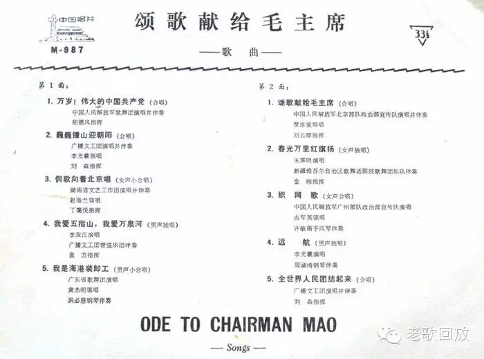 录音翻录自黑胶唱片(唱片号M-987)。颂歌献给,作词:瞿琮,作曲:郑秋枫。原本是女高音独唱歌曲,这款合唱版是北京军区改编的。
