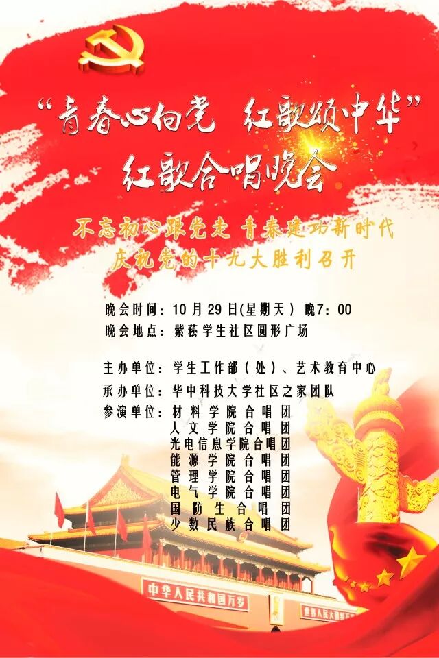 为庆祝党的十九大胜利召开,学生工作部(处)联合艺术教育中心将于10月29日(星期天)晚19:00在紫菘学生社区圆形广场,举办“青春心向党,红歌颂中华”红歌合唱晚会,鼓励广大青年不忘初心跟党走,青春建功新时代,努力打造“先锋社区”。材料学院、人文学院、光电信息学院、能源学院、管理学院、电气学院、国防生、少数民族等8个合唱团联袂演出,共同唱响主旋律,红歌颂中华。