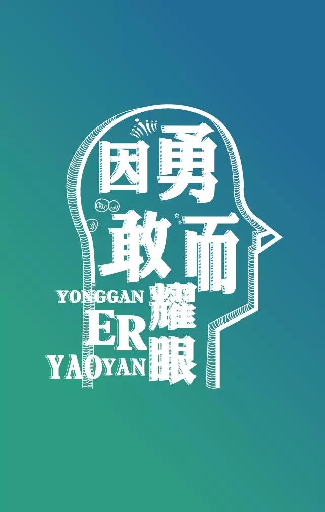 口号诠释了歌曲《勇敢的心》对于“青春就要勇敢向上”的态度。画面用一个年轻男子遥望远方的侧面剪影,表现青春的力量与坚定;文字组合在头像剪影里,寓意年轻人应该勇敢面对人生,迸发最耀眼的光芒。