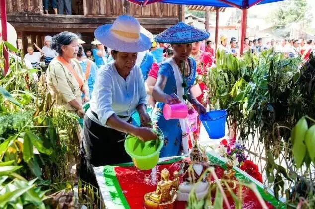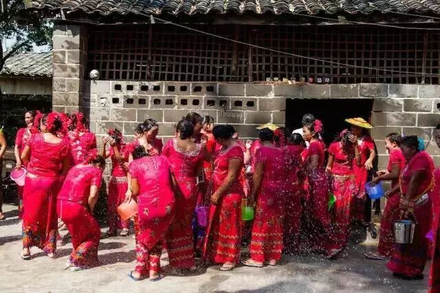 陇川乡村泼水,男女老少都会穿上节日盛装,挑着清水,先到佛寺奘房赕佛、浴佛,然后就开始互相泼水,互祝吉祥、幸福、健康。