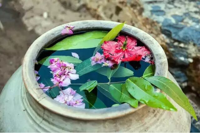 村里道路旁的人家,都会在家门口准备着水缸、盆装满清水,上面撒上花瓣供人们泼水祝福。
