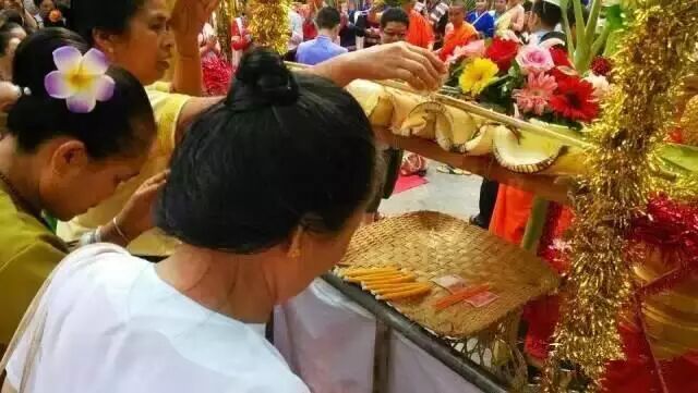 “浴佛”仪式举行时须将新年的精美食品、蜡条等敬献在佛爷面前,双手合十跪拜,接受佛爷赐福后方能举行。
