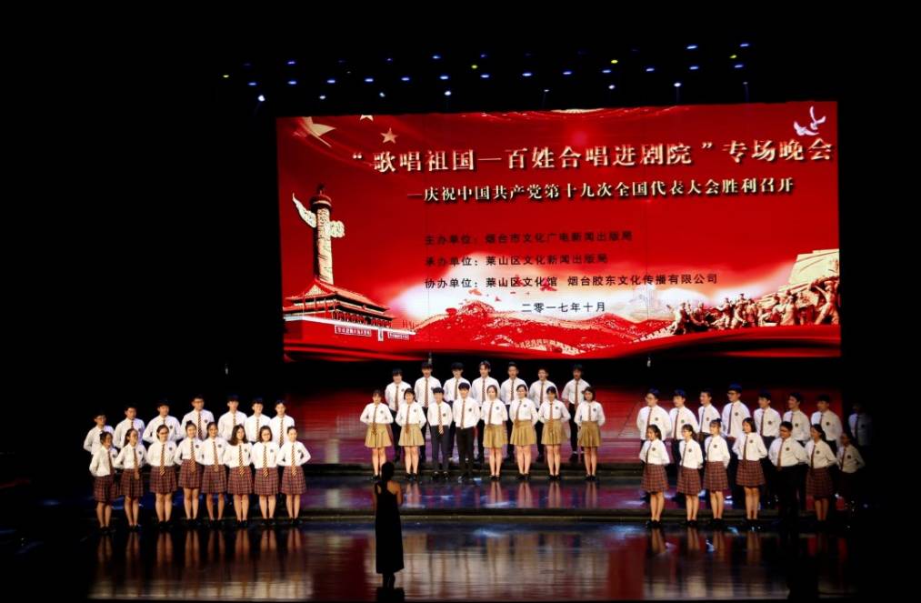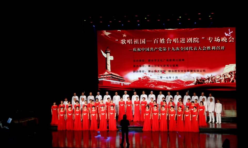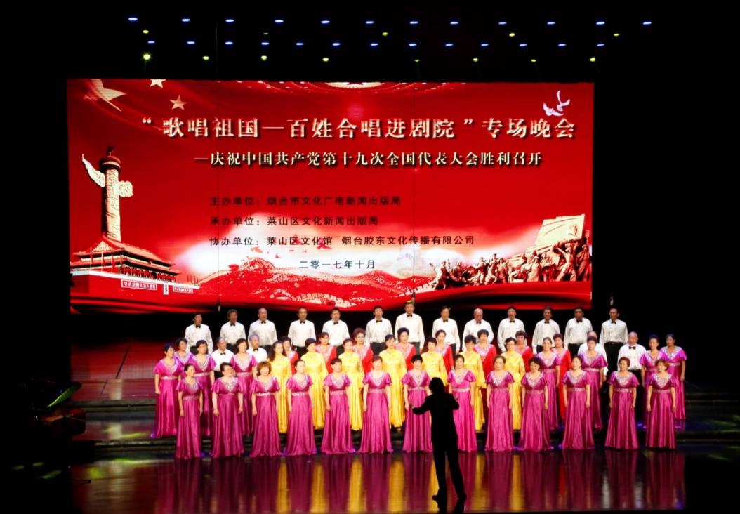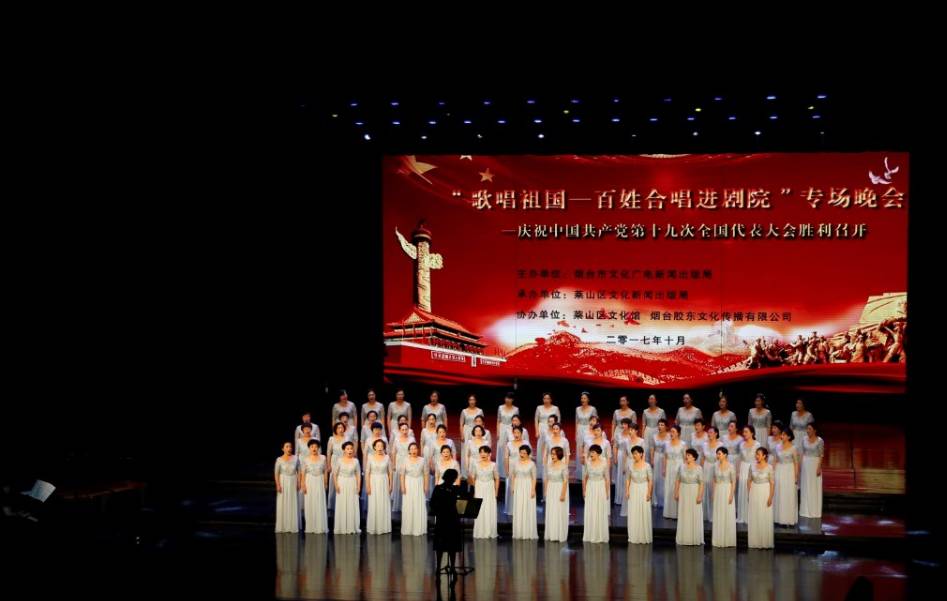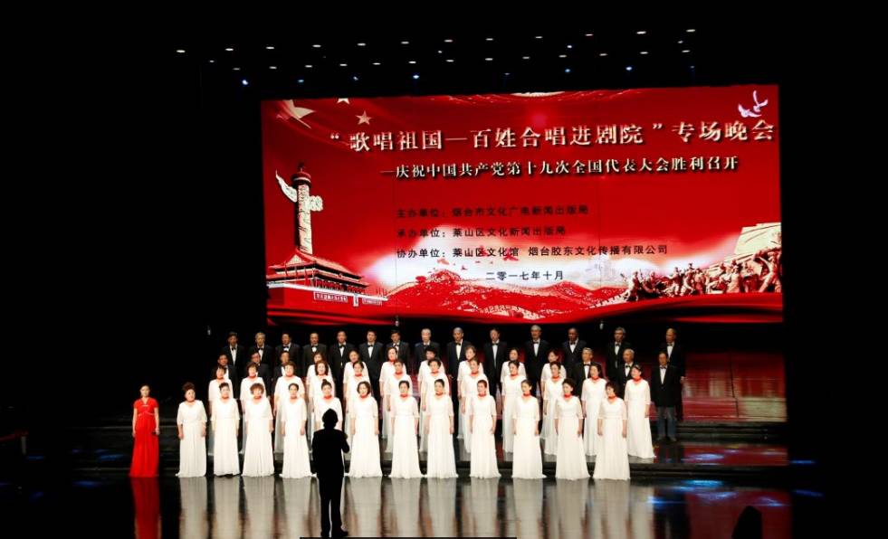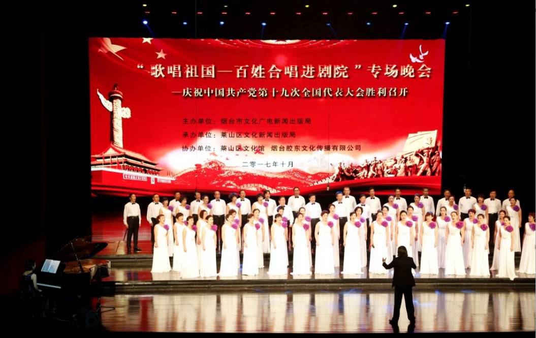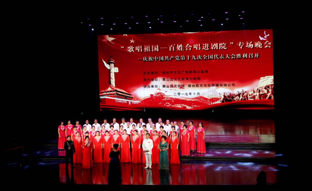 ,弘扬爱国主义华彩乐章,用嘹亮的歌声唱响激情燃烧的岁月,表达烟台市民对党、对祖国的无限热爱之情。2017年10月20日晚由烟台市文化广电新闻出版局主办、莱山区文化新闻出版局承办,莱山区文化馆、烟台胶东文化传播有限公司协办的第二届“歌唱祖国,百姓合唱进剧院”专场晚会在胶东剧院盛大上演!