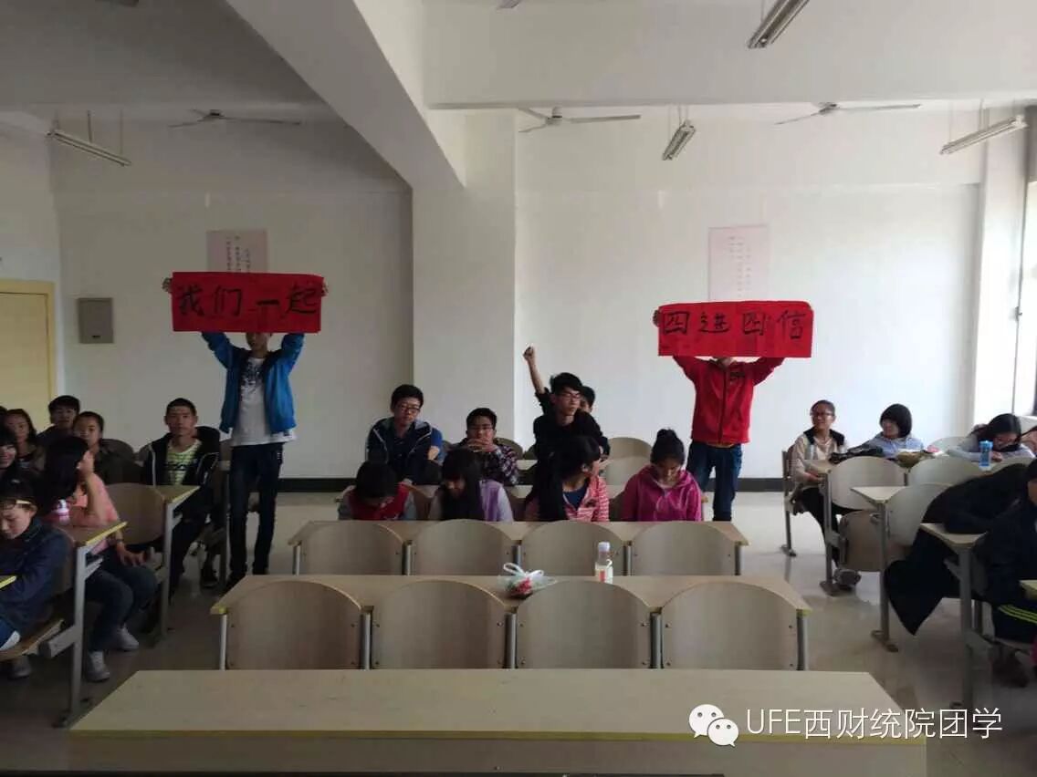 有人曾说过人生是彩色的,然而我们拥有53个成员因此具有53种颜色。从2014年9月到2015年5月这半年多的时间里,由陌生到熟悉,由朋友到知己,我们曾一起军训,一起流汗,一起开过团日活动,一起参加绑腿跑,一起在操场玩游戏,一起参加歌唱比赛等等。团结互助,携手共进。虽然我们来自五湖四海,但我们的心早已聚集于西安财经学院,早已聚集于统计1401。虽然我们各不相同,但我们总能欢声笑语,其乐融融。虽然我们各不相同,但我们心中总是充满对彼此的关怀。我们的梦想是一致的,那就是好好珍惜彼此,努力学习。我们统计1401班会团结互助,努力书写我们的未来。