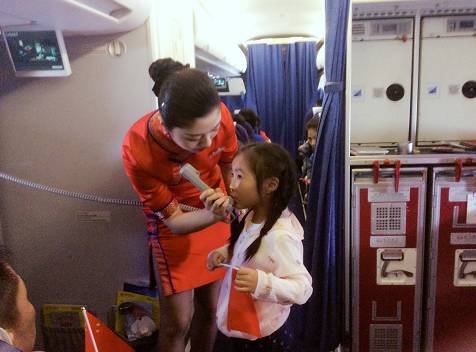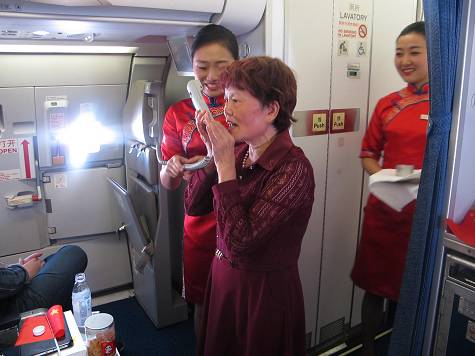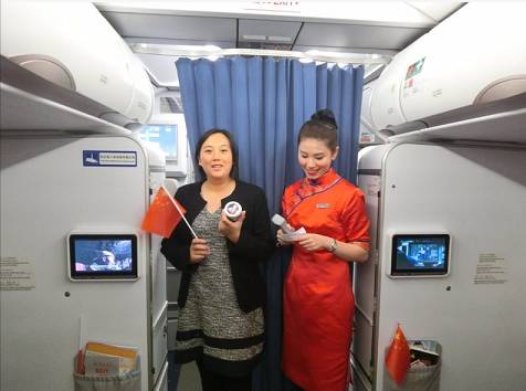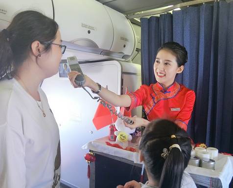 餐饮服务结束后,伴随着《我的祖国》音乐,主持人隆重登场,乘务员们为每位客人送上小国旗,共庆伟大祖国68周年华诞。