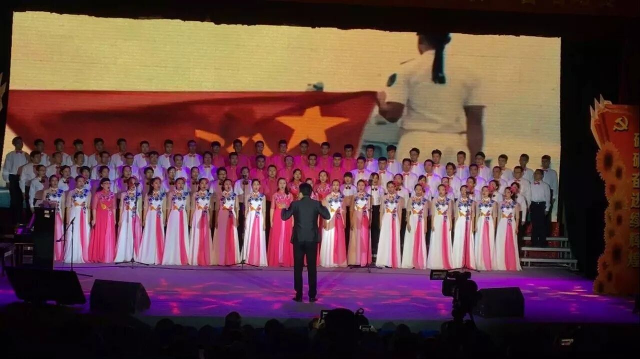 舞台上,老师和同学们的合唱队以饱满的热情,嘹亮的歌声,唱响时代主旋律,用歌声来表达他们的理想信念,用歌声抒发他们敢于攀登,誓创辉煌的豪情!