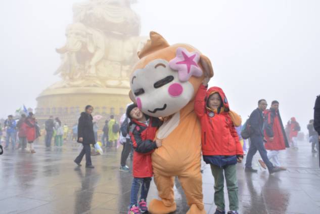 尽管10月3日的金顶细雨朦胧,但是丝毫没有影响到游客的热情。上午11点过,一只“灵猴”出现在了金顶,开始为《歌唱祖国》大合唱热场,引来游客争相与其合影留恋。