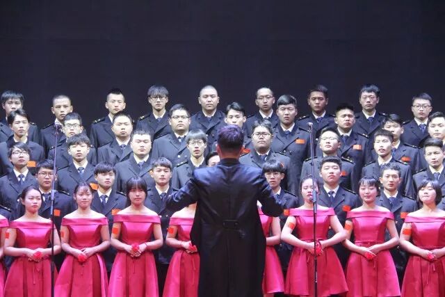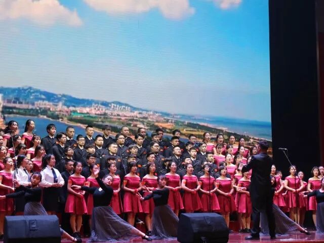 一开场人文院的姑娘们身穿优雅的红色礼服,像国旗,像鲜血,像对祖国热烈而浓厚的爱,男生身穿整洁的制服笔直的站在台上,举手投足中散发着自信、青春、热情、积极奋发的力量。
