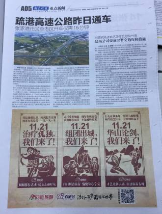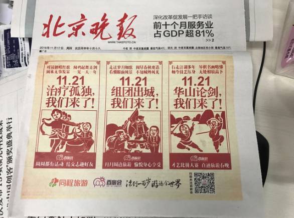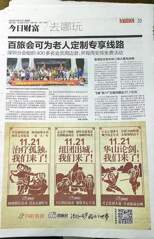 承包各地报纸,只为第一时间将这个好消息告诉你:11月21日,同程百旅会将在全国160个城市全面启动,有您的地方,就有同程百旅会!