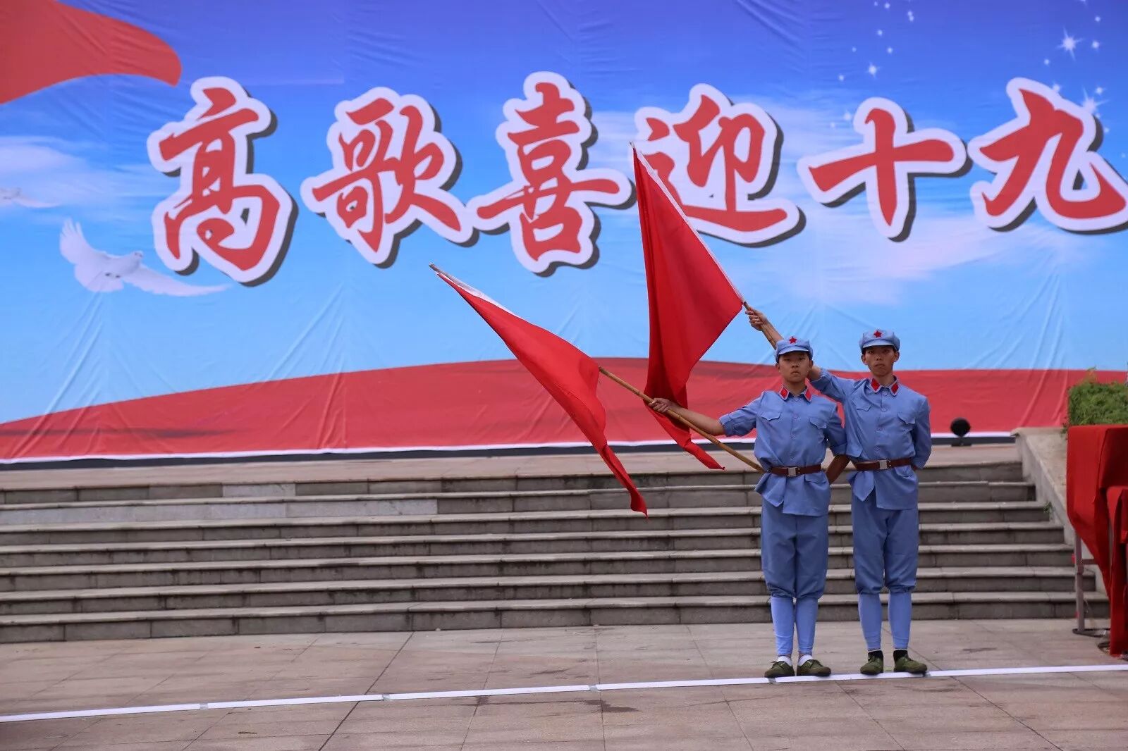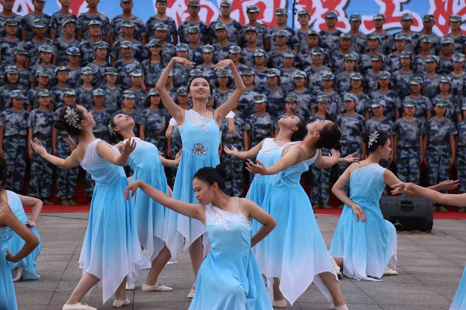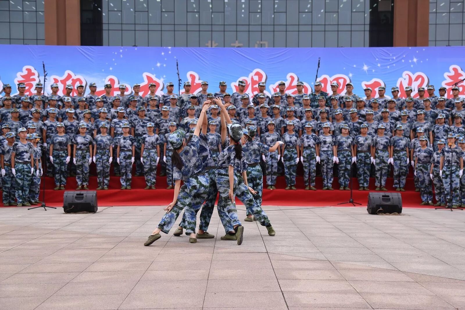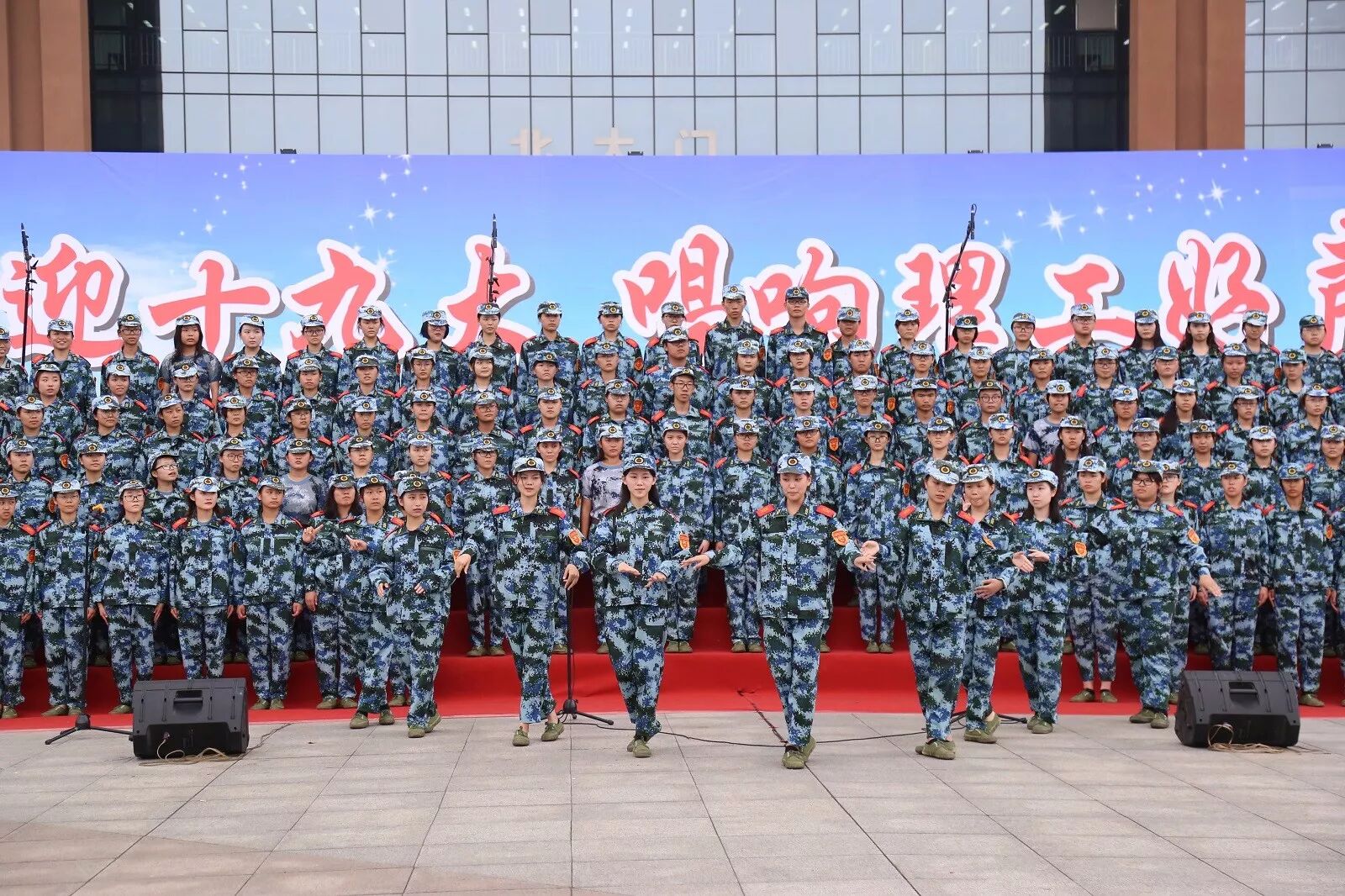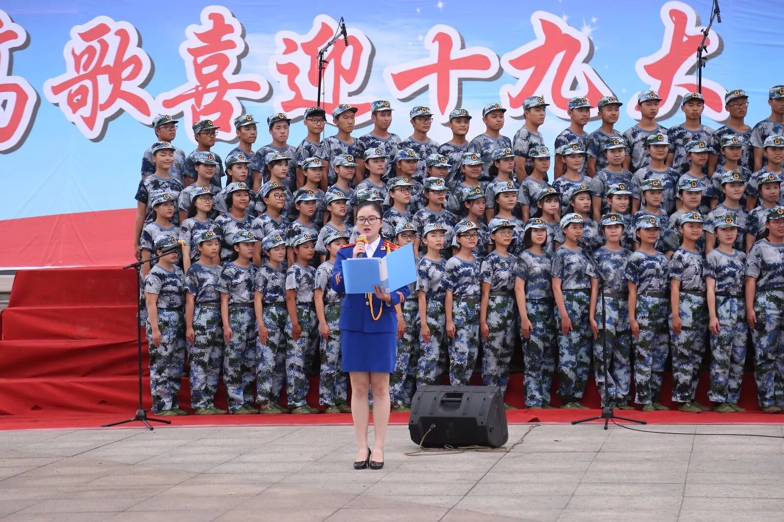 在操场主席台上放声歌唱
