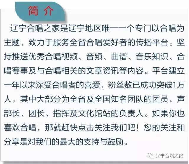 感谢您对【辽宁合唱之家】官方微信公众平台的关注与支持。本平台内容部分来自互联网,素材、图片版权属于原作者,本平台转载素材仅供大家欣赏和分享,切勿做为商业目的使用。如果侵害了您的合法权益,请您及时与我们联系,我们会在第一时间删除相关内容!