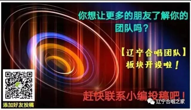 为了更好的服务辽宁的合唱团队,即日起,辽宁合唱之家微信公众平台特增设【辽宁合唱团队】板块,对我省的所有合唱团队(社区、校园、部队、文化馆站、企事业单位等)进行全面的宣传推广,让更多的合唱朋友认识和了解我省的合唱团队。望各合唱团相关负责人积极与版主联系),将【团队简介,获奖情况等文字,演出照片,音频或视频】等相关文件传送给小编。