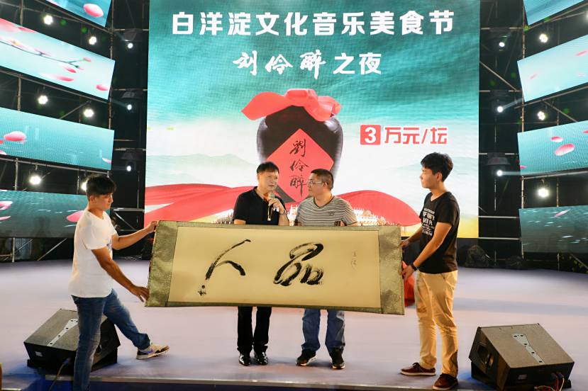 在演唱会最后迟志强挥毫泼墨写下“人品”两字,墨宝在现场以6000元价格拍卖,拍卖所得全款用于慈善事业,这一温馨场面为白洋淀文化音乐美食节.刘伶醉之夜演唱会画下圆满句号。