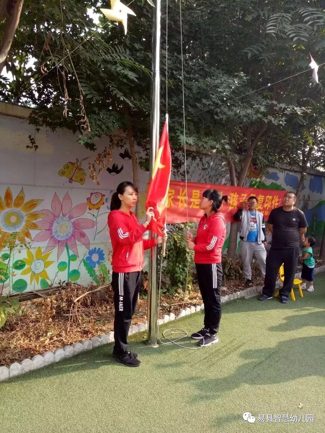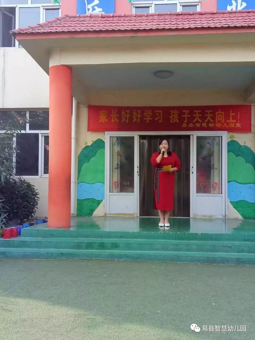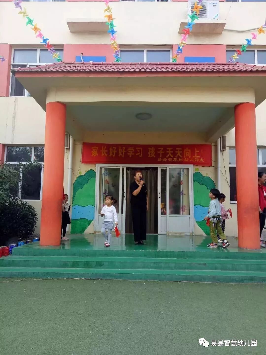 园长阿姨进行国旗下讲话,对大朋友和小朋友进行爱国教育