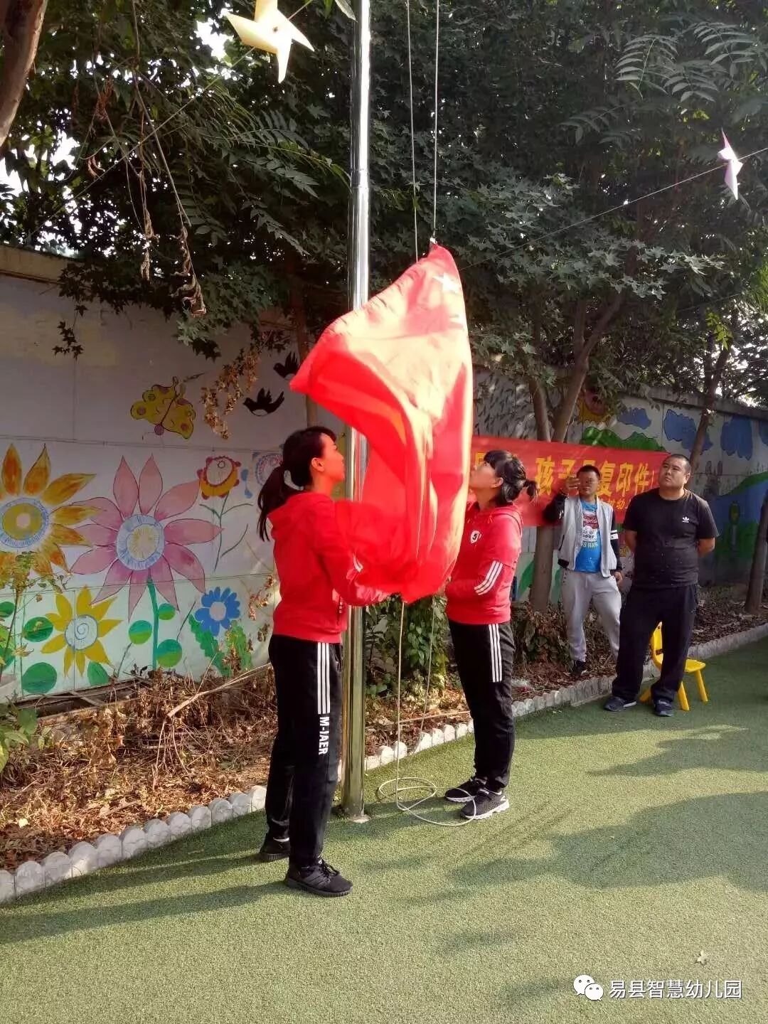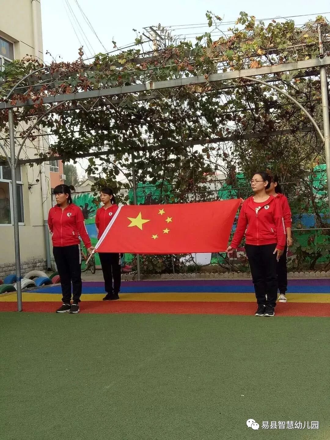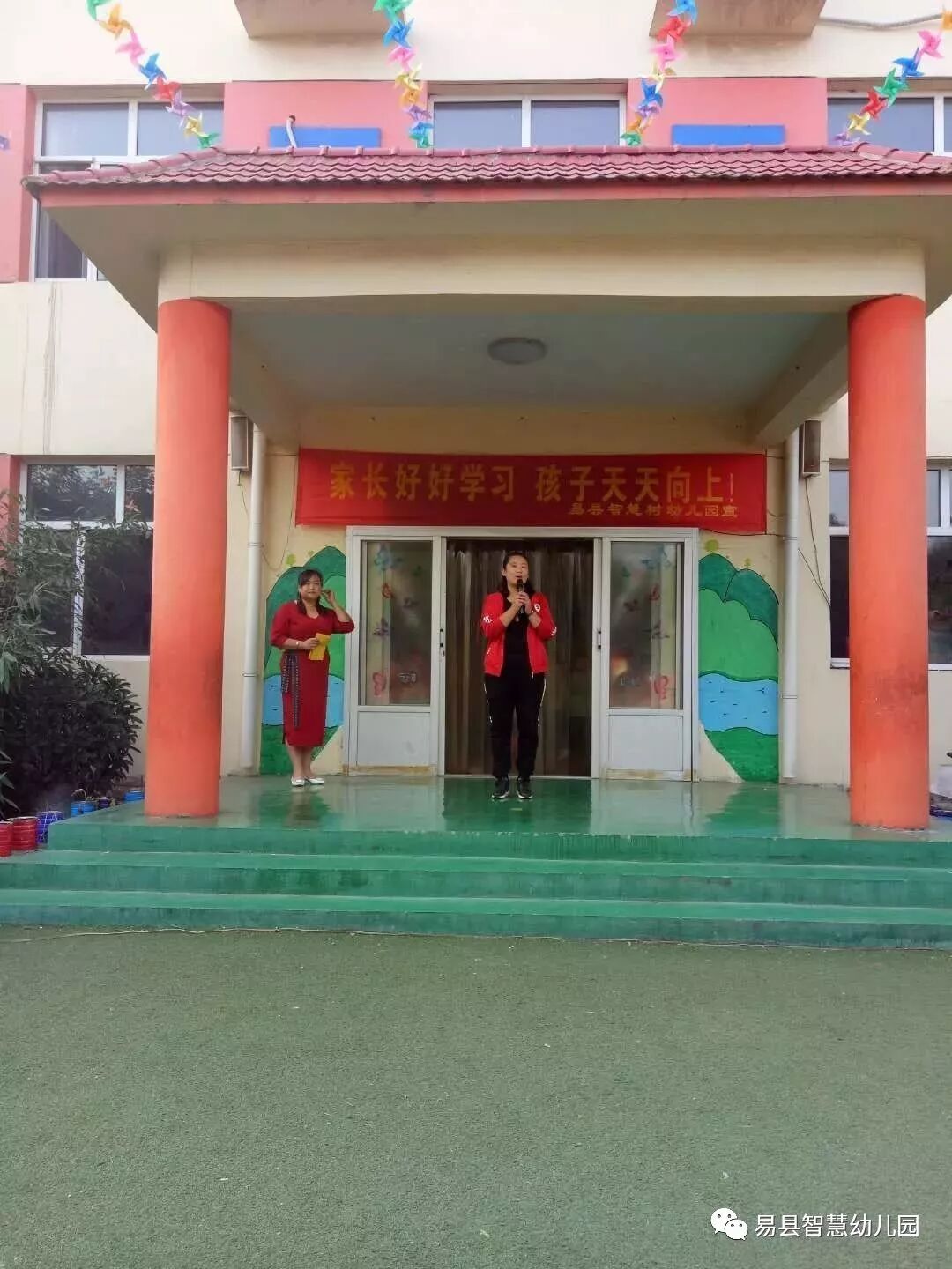 园长阿姨进行国旗下讲话,对大朋友和小朋友进行爱国教育