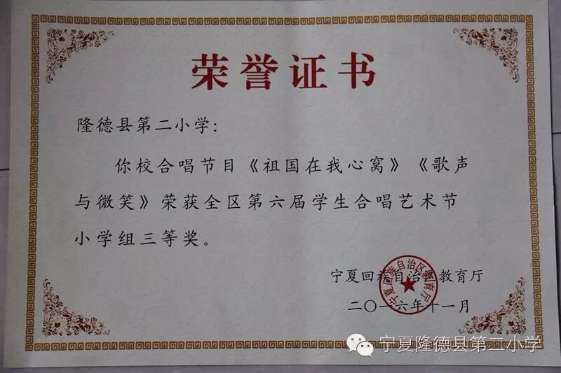 在全区第六届学生合唱艺术节节目展演活动中,我校合唱节目《祖国在我心窝里》和《歌声与微笑》荣获小学组三等奖。这是我校合唱队继隆德县第一届学生合唱节取得一等奖之后的又一次殊荣。